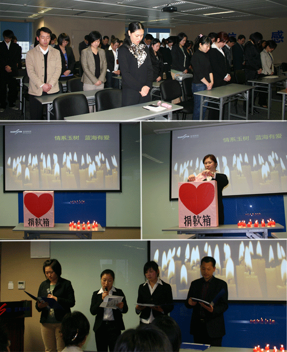 4月21日下午五點(diǎn),藍(lán)海集團(tuán)上??偛康呐嘤?xùn)室一片肅穆凝重,“情系玉樹藍(lán)海有愛”捐款活動(dòng)在人資行政部的組織下召開了。全體員工不但向遠(yuǎn)在千里之外的玉樹受災(zāi)人民表達(dá)了衷心的慰問,而且還踴躍進(jìn)行愛心捐助,現(xiàn)場募捐總額高達(dá)18585元人民幣,董事長王彥博女士表示:“我個(gè)人將捐出員工捐款的總額,一同委托給上海紅十字會(huì)轉(zhuǎn)交玉樹當(dāng)?shù)卣?,為?zāi)區(qū)同胞們購置緊缺物資,和他們攜手共渡難關(guān)!救援玉樹人人有責(zé)?!?/p>