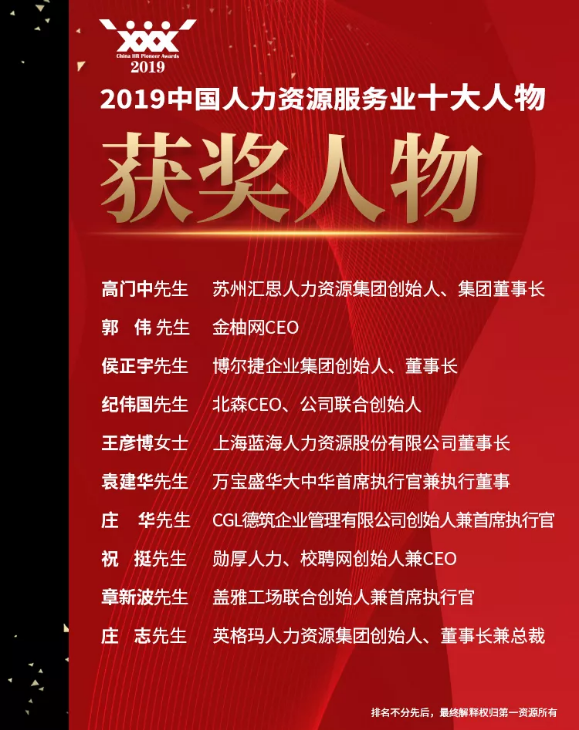 本次“2019中國人力資源服務業(yè)十大人物”榜單的誕生,主要彰顯了“第一資源”作為中國領先的人力資源第三方媒體平臺對突破、創(chuàng)新、顛覆的鼓舞與推崇,旨在中國人力資源行業(yè)評選出本年度最具行業(yè)推動力的人力資源服務機構、個人,表彰他們?yōu)橹袊髽I(yè)人力資源管理進步做出的杰出貢獻。
