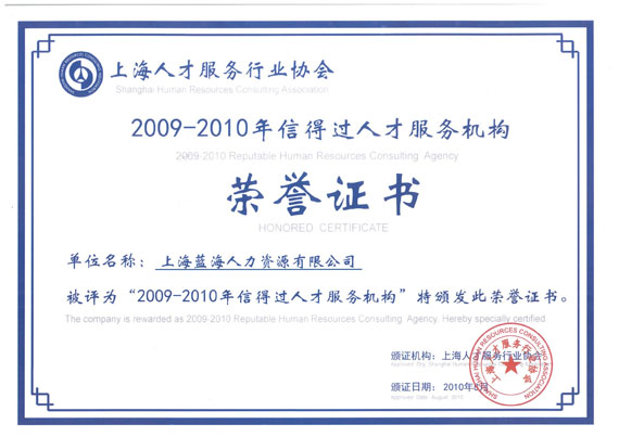 由上海人才服務(wù)行業(yè)協(xié)會(huì)主辦的“2009-2010年上海市信得過(guò)人才服務(wù)機(jī)構(gòu)”頒獎(jiǎng)典禮昨天下午舉行。本次會(huì)議上共計(jì)89家人力資源服務(wù)機(jī)構(gòu)榮獲“信得過(guò)人才服務(wù)機(jī)構(gòu)”稱(chēng)號(hào)。藍(lán)海集團(tuán)憑借著多年來(lái)優(yōu)質(zhì)的服務(wù)美譽(yù)度、良好的市場(chǎng)口碑以及廣泛的社會(huì)影響力獲此殊榮。