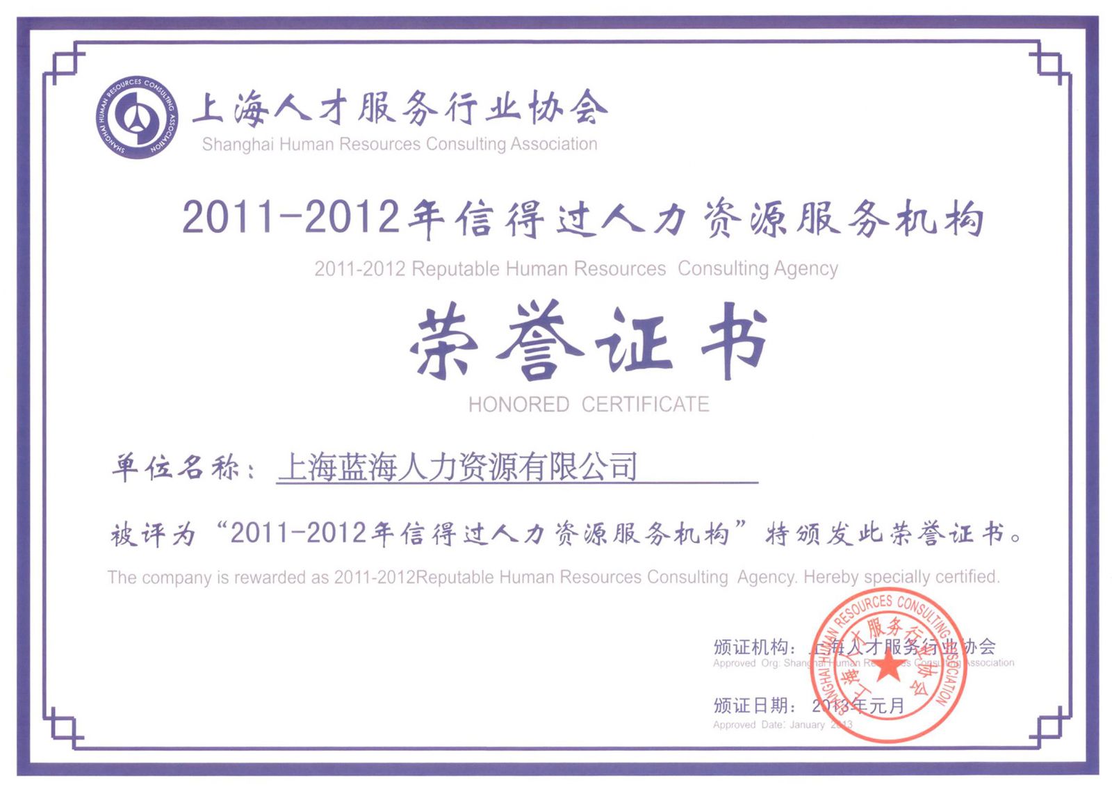 藍海集團榮獲“2011-2012年上海市信得過人力資源服務機構(gòu)”的殊榮,是社會、業(yè)界及客戶對藍海的充分肯定。今后藍海集團將不斷創(chuàng)新,致力于推進人力資源服務行業(yè)更加健康、快速的發(fā)展。