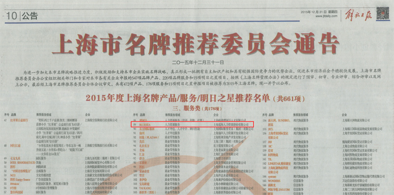 2015年12月31日,“上海市名牌推薦委員會(huì)通告”在《解放日?qǐng)?bào)》進(jìn)行公示,共有472項(xiàng)產(chǎn)品、178項(xiàng)服務(wù)和11項(xiàng)明日之星上榜。上海藍(lán)海人力資源股份有限公司在本次評(píng)選中脫穎而出,榮獲“2015年度上海名牌服務(wù)”稱號(hào),也是普陀區(qū)人才服務(wù)唯一入圍的企業(yè)。