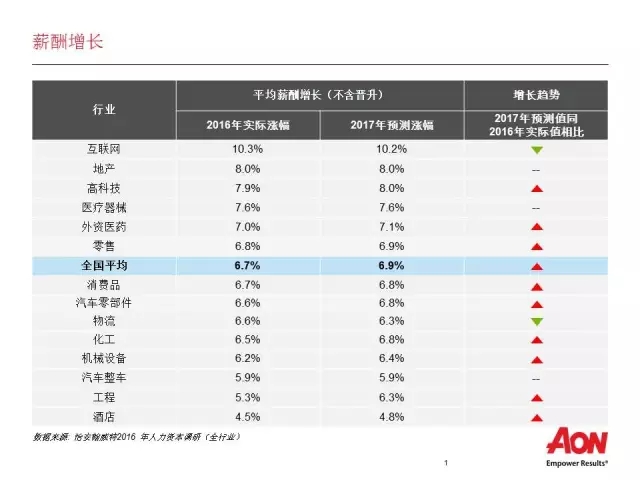 今年,全國(guó)平均薪酬漲幅(不含晉升)持續(xù)下降至6.7%,與GDP增幅持平,2017年預(yù)計(jì)平均薪酬漲幅為6.9%(不含晉升)。然而,今年薪酬漲幅行業(yè)差異化顯著。其中,以互聯(lián)網(wǎng)(10.3%)領(lǐng)先,地產(chǎn)(8.0%)、高科技(7.9%)和醫(yī)療器械(7.6%)位居前列。外資醫(yī)藥(7.0%)和零售行業(yè)(6.8%)的薪酬漲幅也高于全國(guó)平均,而工程(5.3%)和酒店行業(yè)(4.5%)的薪酬漲幅則維持在一個(gè)相對(duì)較低的水平。